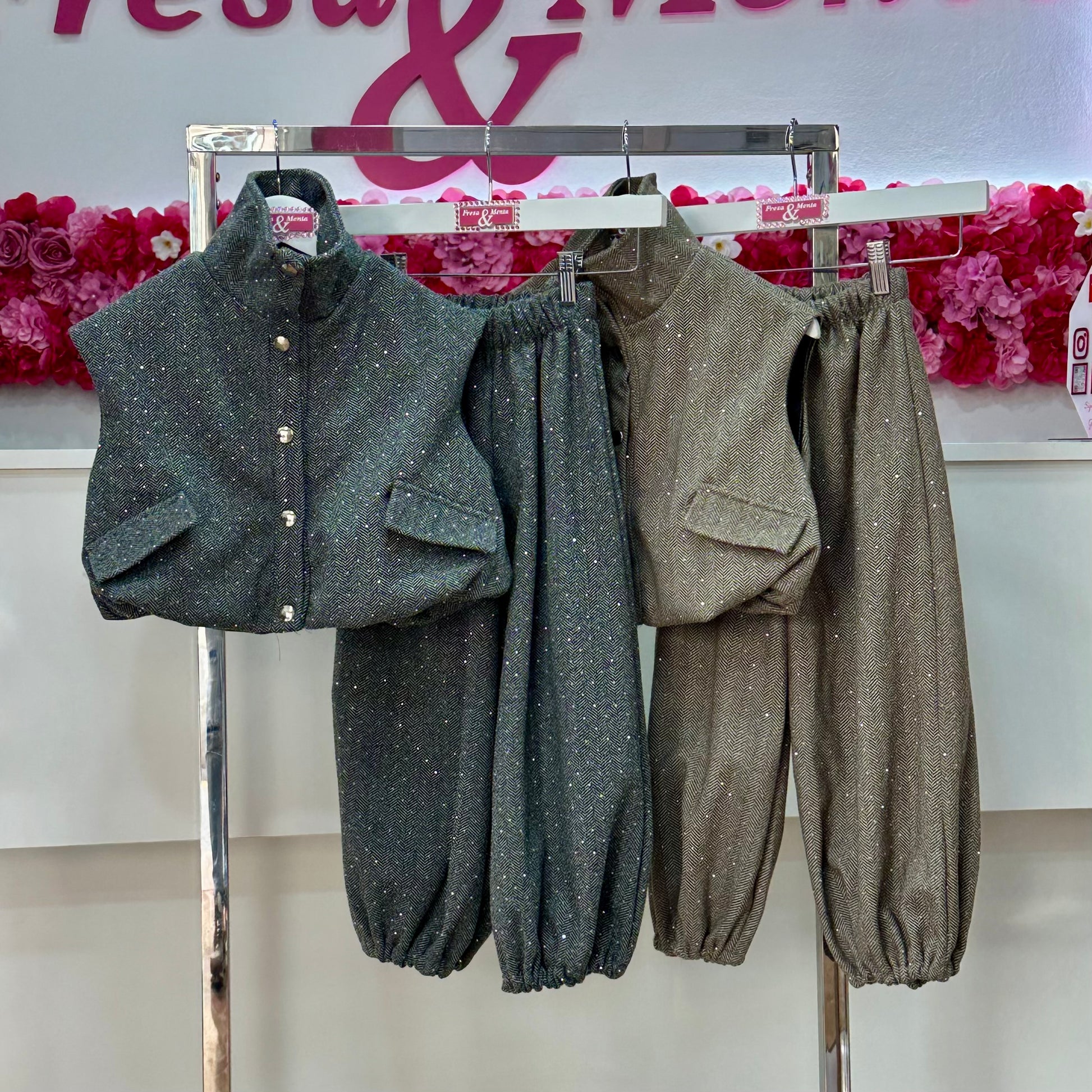 Este conjunto de chaleco y pantalón es perfecto para niñas de 4 a 14 años. El chaleco está forrado y el pantalón tiene un cómodo puño y está tejido con brillantes chispitas, lo que lo hace único y divertido. Mantén a tu niña abrigada, cómoda y con estilo con este conjunto.