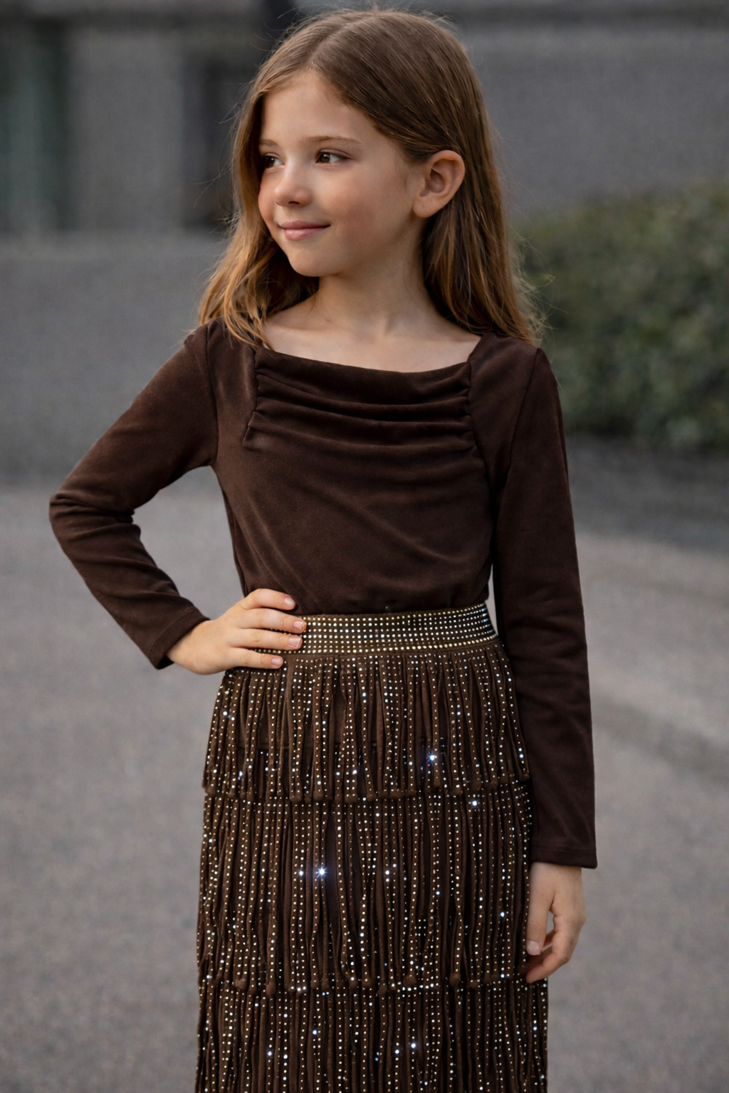 Esta elegante falda de fiesta para niñas de 4 a 14 años es perfecta para cualquier ocasión especial. Confeccionada con materiales de alta calidad, cuenta con hermosos flecos y detalles de pedrería que le dan un toque de sofisticación. ¡Haz que tu pequeña se sienta como una princesa con esta falda única!